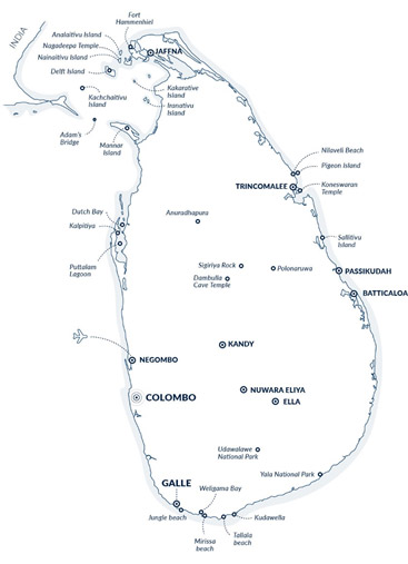 The East Coast Cruise departs from Trincomalee and returns to Trincomalee.