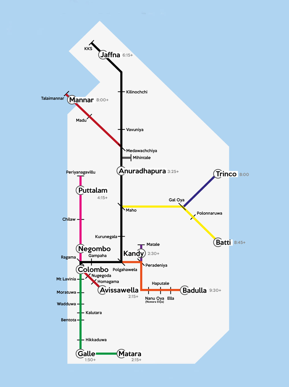 Encouraged by the successful operation of Colombo-Kandy mainline, the then government of principle decided to expand the railway network to various other destinations in the country, by the 20th century there were few other railway lines under construction. In 1902, the northern line construction commenced from Jaffna end and Medawachchi-Talaimannar was opened in 1914. By 1928 Trincomalee and Batticaloa light railway was completed. The line up to Puttalam was opened in 1925, thus completing a total length of 1453 km covering all the 09 provinces of country.